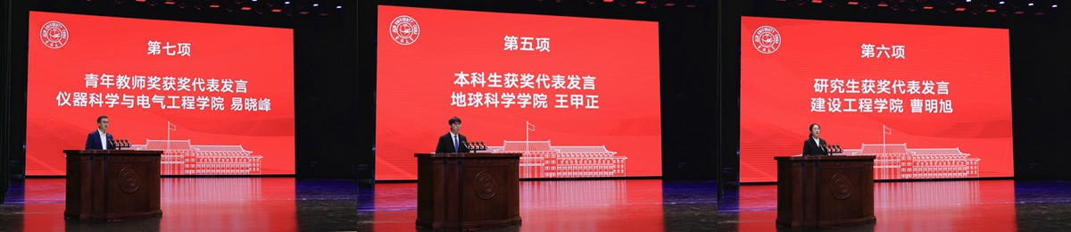 随后,仪器科学与电气工程学院易晓峰教授、地球科学学院本科生王甲正、建设工程学院博士研究生曹明旭分别作为获奖师生代表发言,表达了对母校培养的感恩之情和继续投身地学事业、服务国家发展的坚定决心。