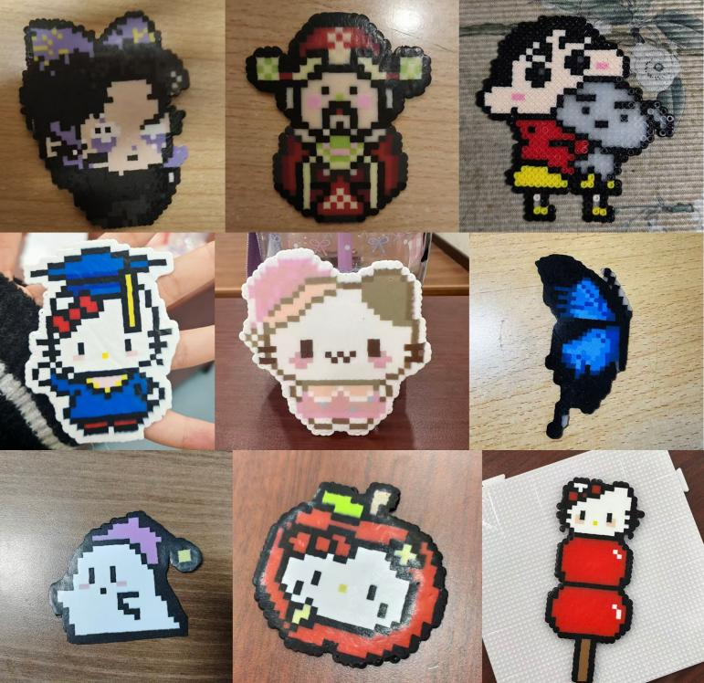 同学们专注于专属作品创作,开启独立创作环节。大家或对照模板细致操作,将拼豆逐一归位;或发挥创意自主配色、勾勒图案,将对生活的热爱与美好期许融入设计。指尖操作间,红、黄、蓝、绿等色彩的拼豆逐步汇聚,化作一件件独具特色的成品。